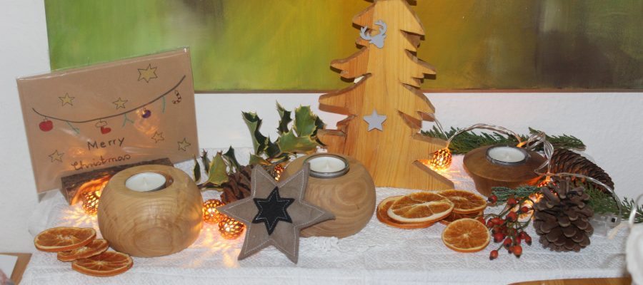 Gleichzeitig gibt es die Möglichkeit in unserem kleinen Basar das ein oder andere Geschenk aus unseren schönen, selbsthergestellten Advents– und Weihnachtsartikeln erwerben zu können.